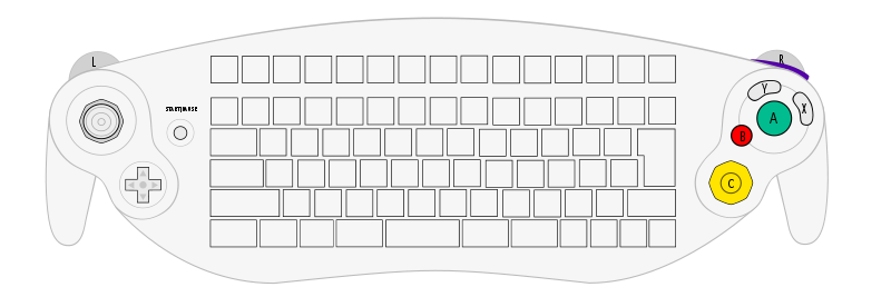 The ASCII keyboard controller resembles a standard GameCube controller pad stretched to accommodate an alphanumeric keyboard in the center. The keyboard requires the use of two controller ports and contains both Latin and Japanese hiragana characters. It was developed for use with Phantasy Star Online Episode I & II.