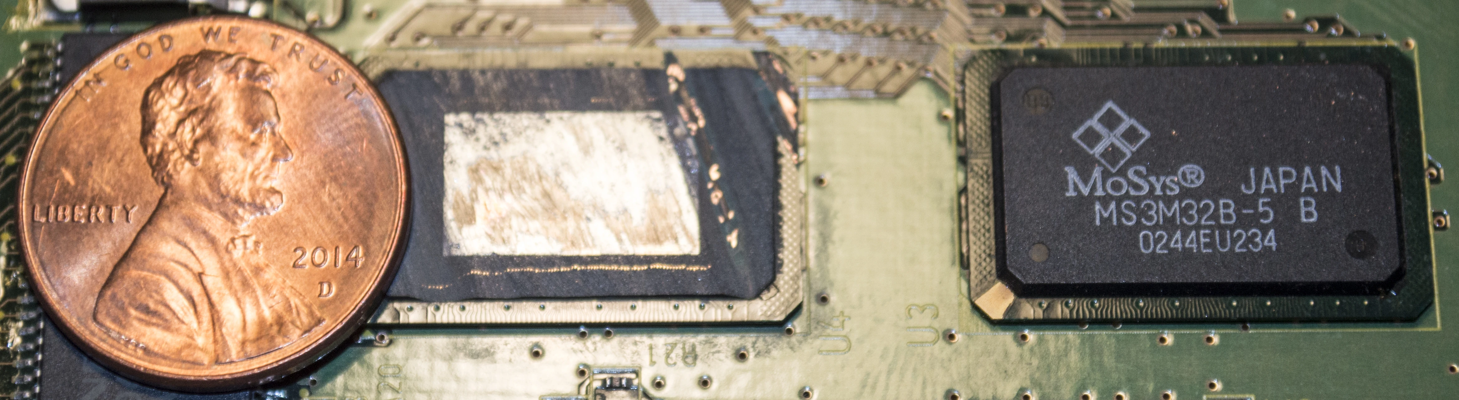 One of the two 1T-SRAM RAM modules shaven down to expose the die.